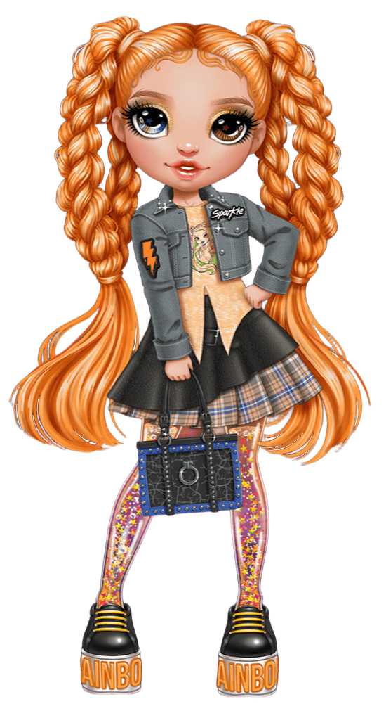 For her signature outfit, she wears a gray jean jacket with a light tangerine shirt underneath that is angularly cut at the waist. She also has an asymmetrical black skirt with a light tangerine, white, and plaid pleated underskirt. Having bare legs, she pairs all this with bulky black sneakers with thick light tangerine laces and "RAINBOW" printed in orange on the sides of the soles.