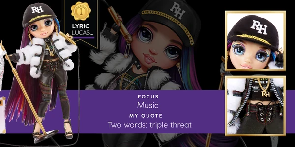 Lyric Lucas 是 2021 年推出的全能角色。 她是彩虹高中的一名学生,主修音乐 - 声乐。 你可能还记得她在 Kidz Club 节目中的 Lyric。 但事实是,这个从童星变身摇滚女神的人一直都知道她注定要成为超级明星(和彩虹高中)。 她自信、干劲十足,而且是一位了不起的歌手——但有时她会被认为有点像天后,因为她具有非凡的个性。 本质上,她只是一个知道自己想要什么的女孩,她会不惜一切代价去得到它。 在彩虹高中,她是一名高年级学生,当她走过大厅时几乎可以清理大厅。