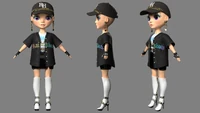 Lyric 的第二套服装包括带彩虹缝线和印有“彩虹”字样的黑色棒球衫,里面她穿着一件印有“彩虹”字样的白色 T 恤,她的裙子穿着带彩虹缝线和腰带的黑色皮裙 上面写着“Rainbow”。对于她的鞋子,她穿着白色及膝高跟鞋,黑色鞋底,金色拉链和带扣的黑色肩带。